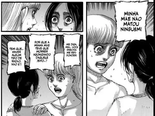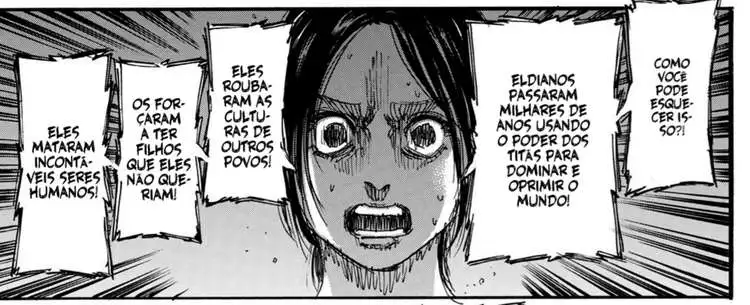 “Dizem que antes do domínio dos titãs, havia matanças sem fim por questões de raça e ideologia. E alguém disse que se uma ameaça externa poderosa aparecesse, os humanos parariam com as guerras e se uniriam. O que você acha disso?”