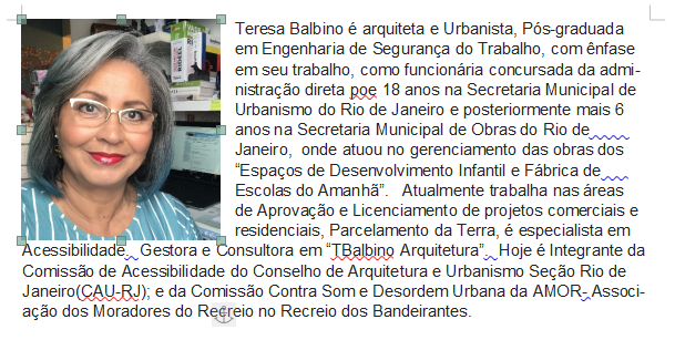 Meu nome é Teresa Balbino, sou arquiteta e Urbanista, especialista em acessibilidade, fico muito feliz em poder ajudar!