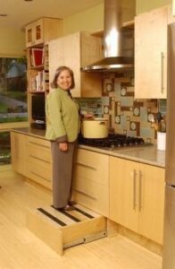 Se você tem baixa estatura, ou nanismo, pode optar por uma solução semelhante a essa, um dispositivo assim ao longo de toda a bancada, ou não! Como preferir. Se não for assim que quer, se não se sentir segura(o), a opção da foto 4, com gavetões e módulos sobre rodízios é fantástica.