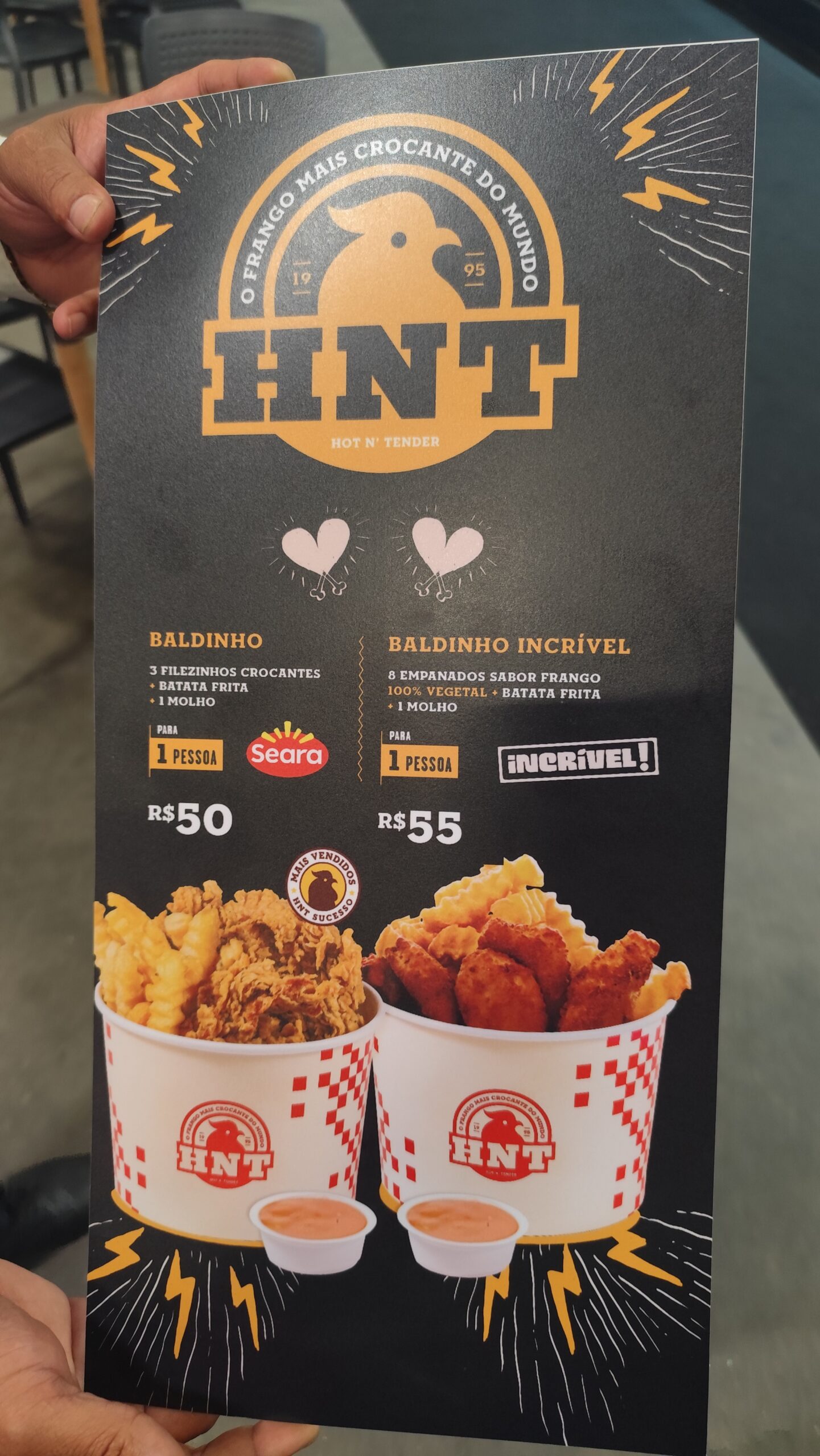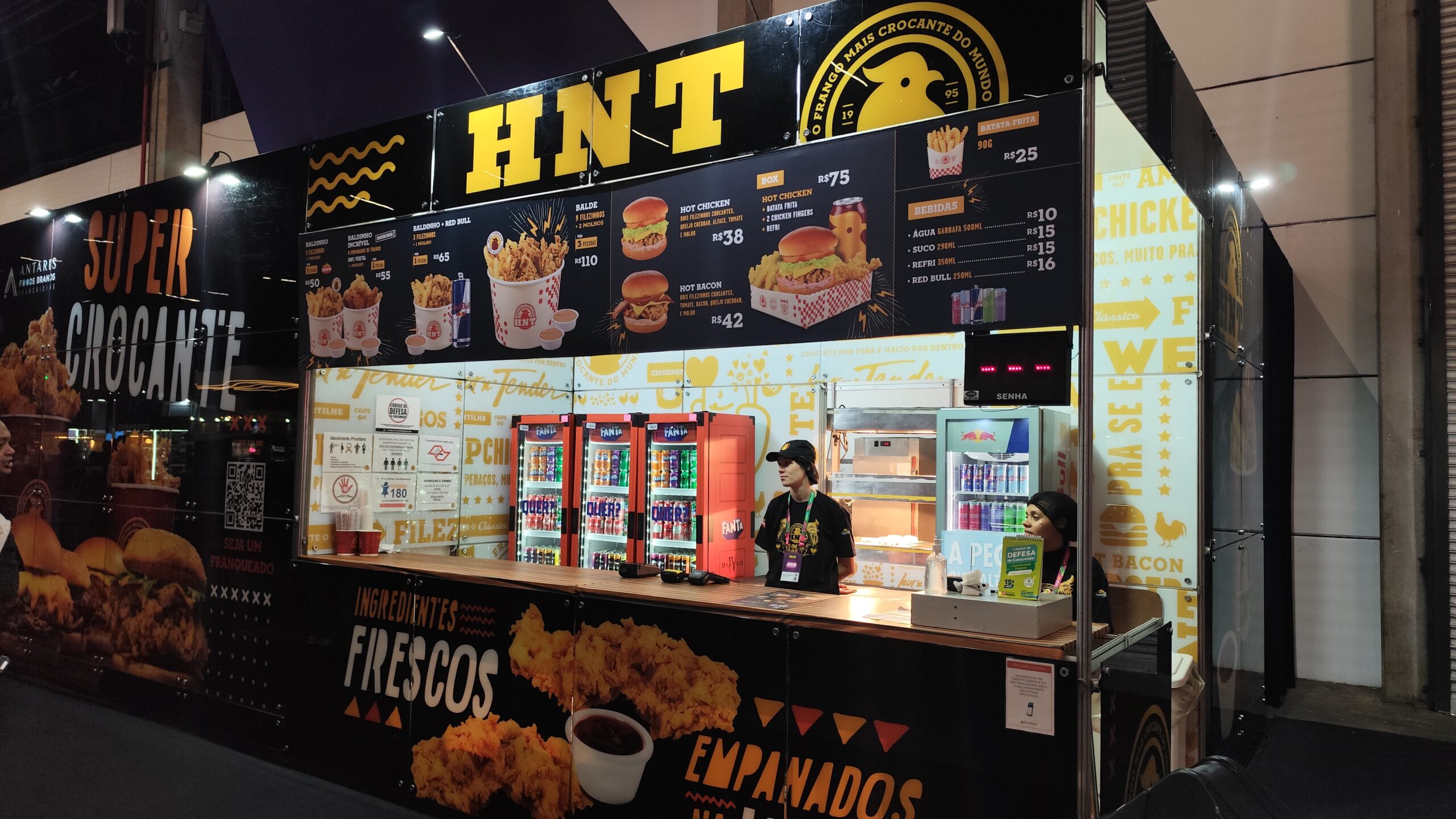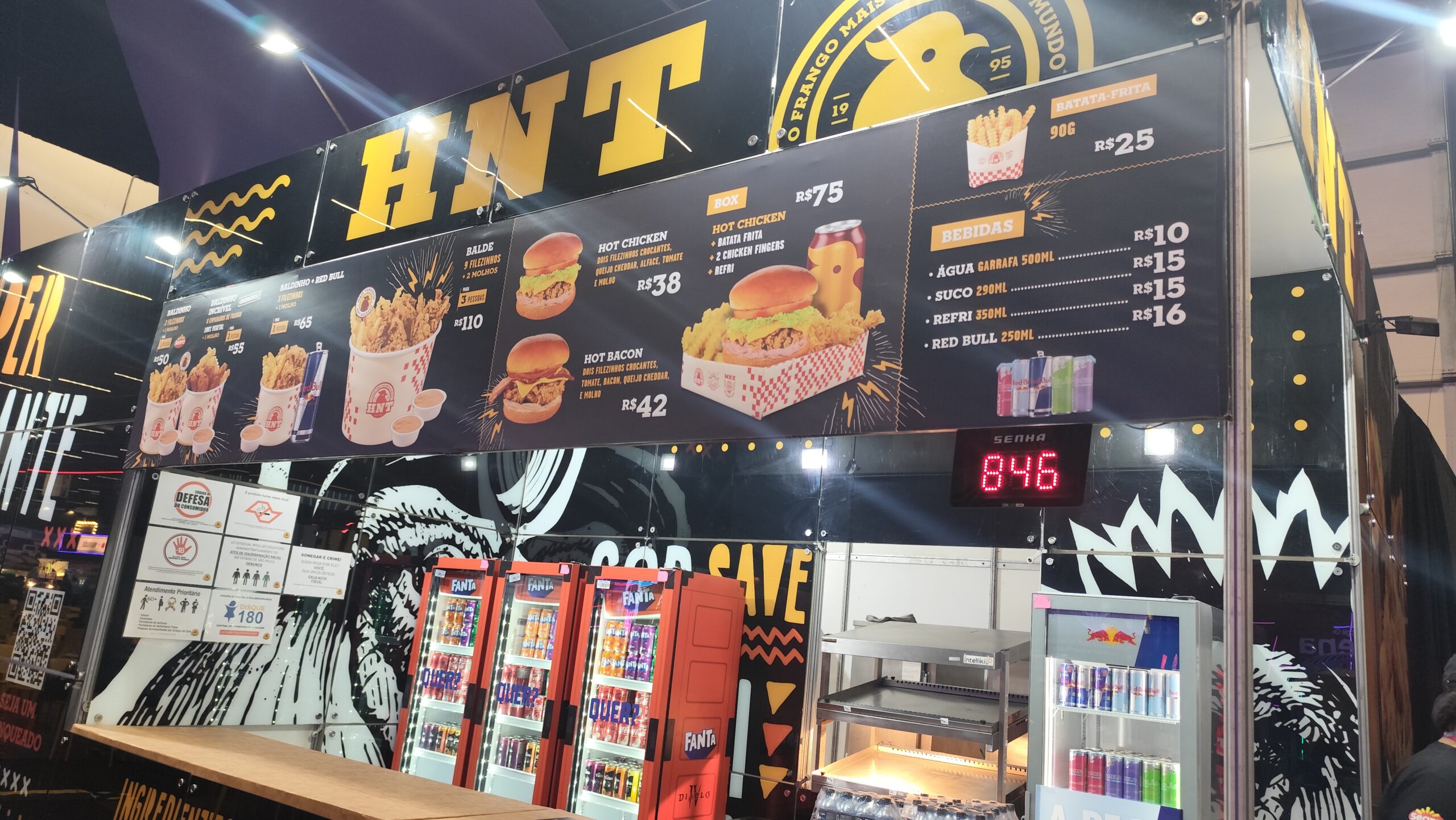 Frango Frito e Snacks No estande do HNT, os famosos baldes de frango são o carro-chefe, variando de R$ 50,00 a R$ 55,00 (versão 100% vegetal). Sanduíches de frango custam entre R$ 38,00 e R$ 42,00.