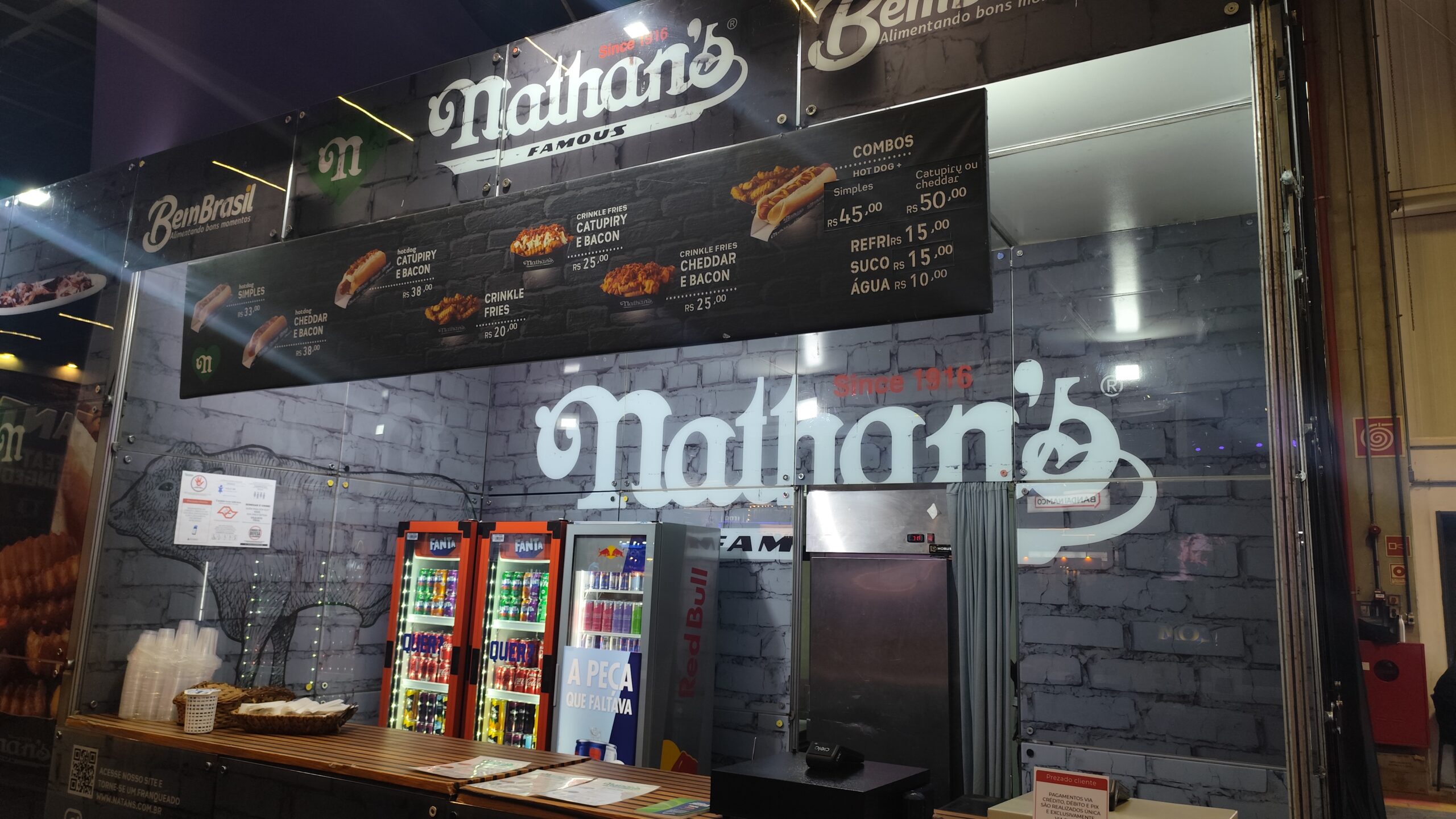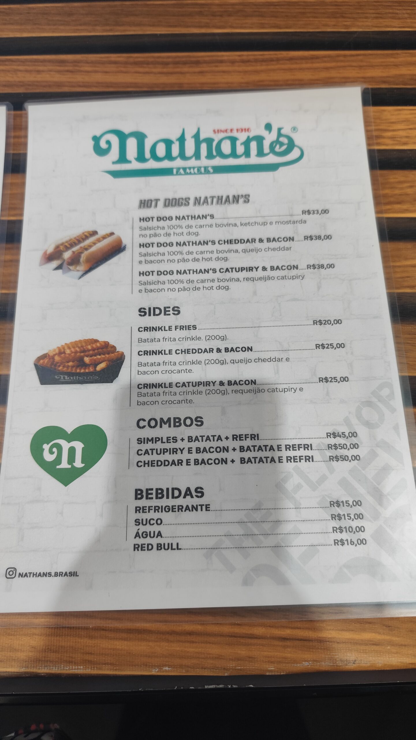 Cachorro-Quente e Clássicos A Nathan’s Famous, tradicional marca de hot dogs, oferece combos simples por R$ 45,00 e versões com Cheddar e Bacon por R$ 50,00. As batatas fritas crinkle acompanham a partir de R$ 20,00.