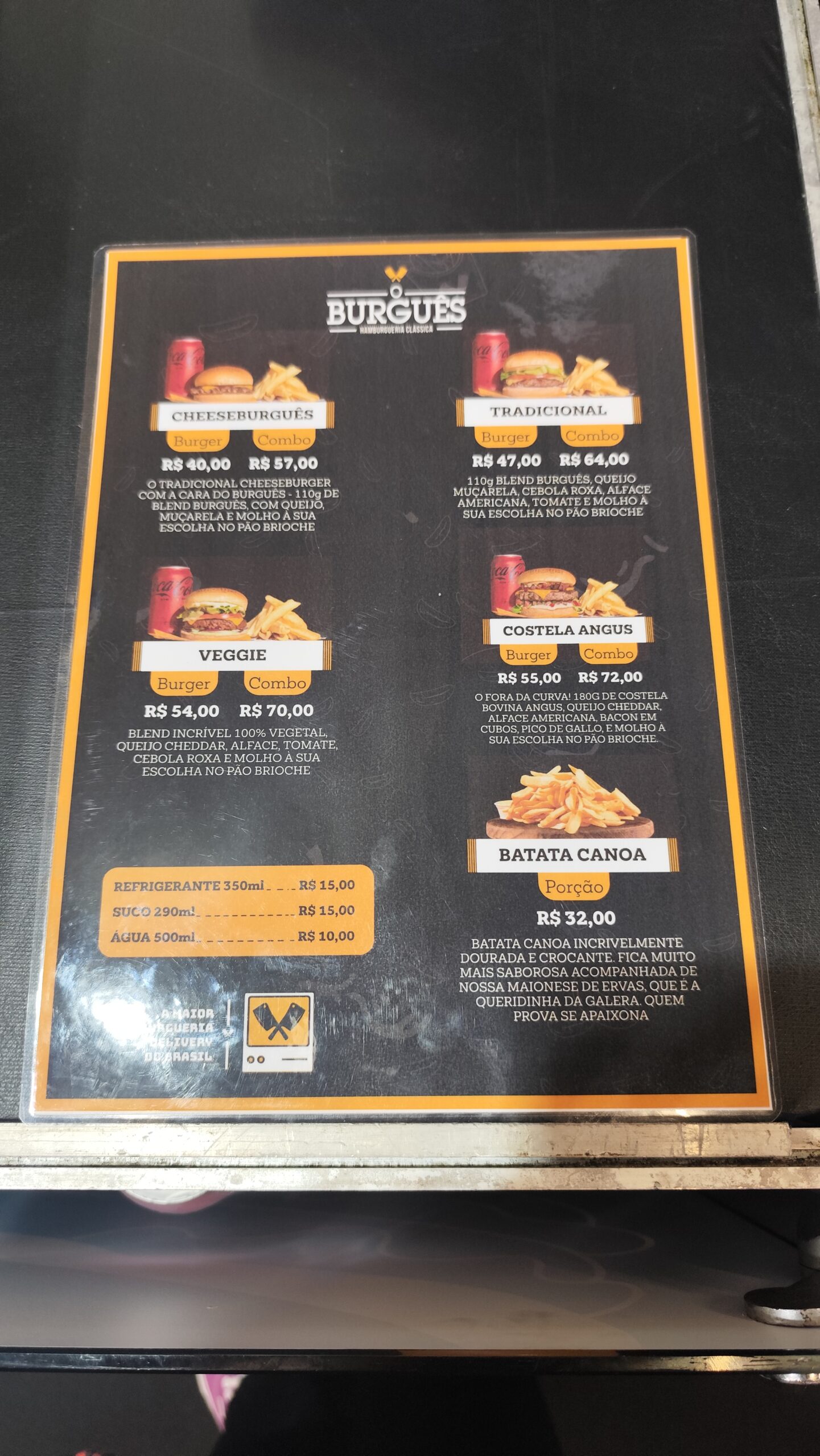 Hambúrgueres e Sanduíches Artesanais A rede O Burguês marca presença com opções robustas. O hambúrguer tradicional custa R$ 47,00 (ou R$ 64,00 no combo), enquanto a versão com Costela Angus sai por R$ 55,00 (lanche) e R$ 72,00 (combo). Há também opção vegetariana por R$ 54,00 o sanduíche.
