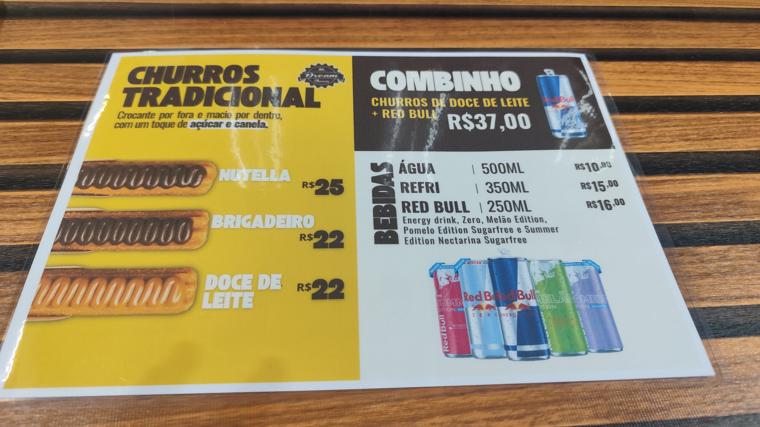 Sobremesas e Bebidas Para a sobremesa, o Mr. Dream Churros vende unidades a partir de R$ 22,00 (Doce de Leite/Brigadeiro) chegando a R$ 25,00 (Nutella). A hidratação segue preços tabelados na maioria dos pontos:
