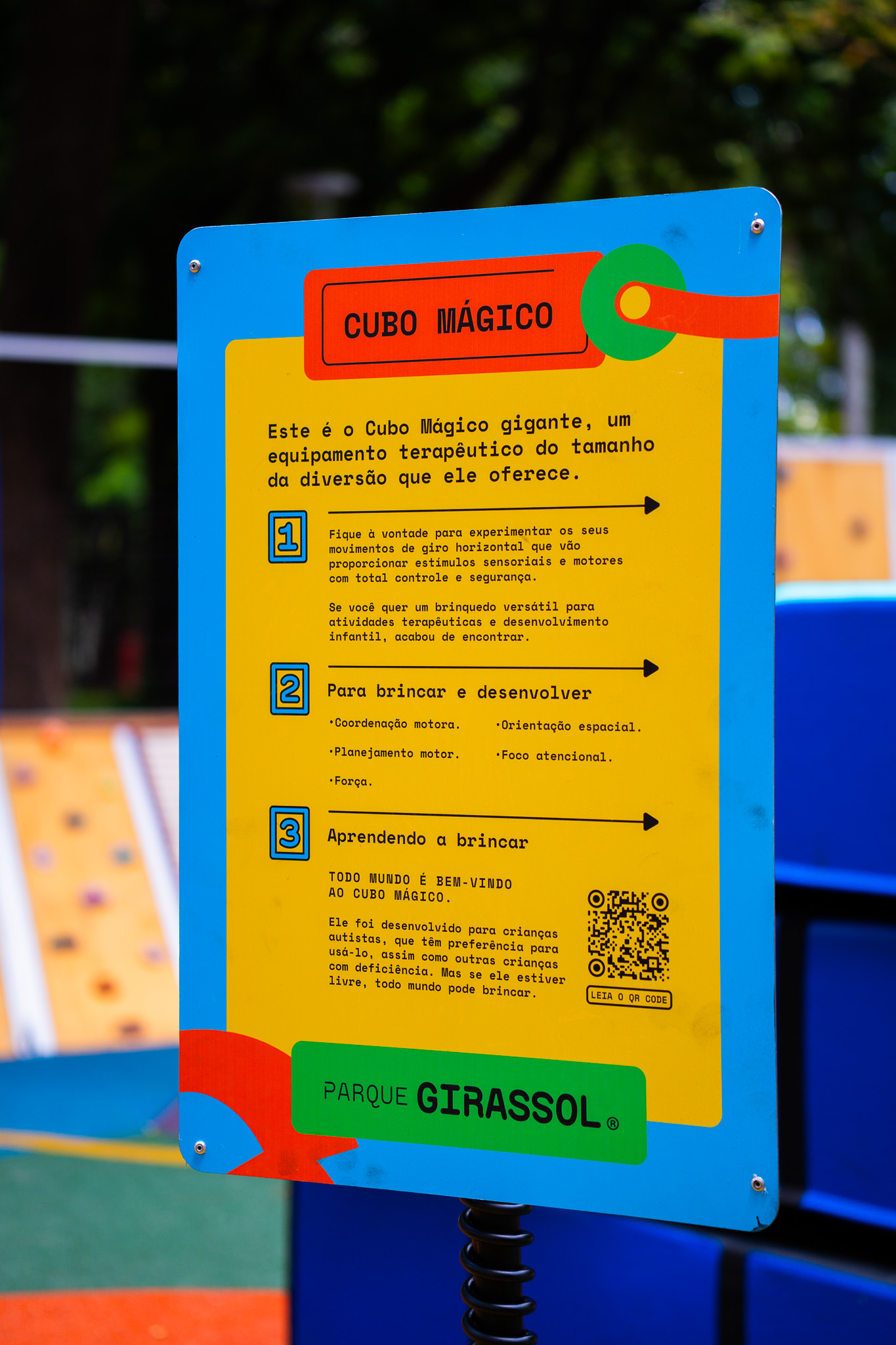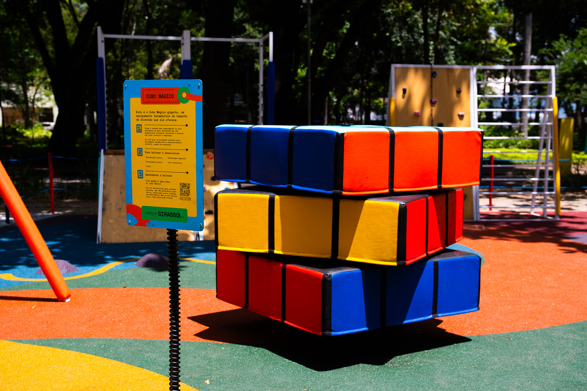 O parque conta com plataformas de movimento, painéis sensoriais, rotas de equilíbrio e elementos táteis. Segundo Barbara Moura, terapeuta ocupacional envolvida no projeto, o local funciona como uma ponte: “O Parque Girassol é a ponte entre o ambiente clínico e o espaço público, onde as adversidades ganham acolhimento, respeito e bem-estar”.